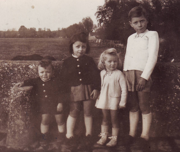 de gauche à droite : Albert (tonton), Madeleine (maman), Mireille et Roger (parrain), en 1946.